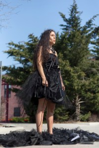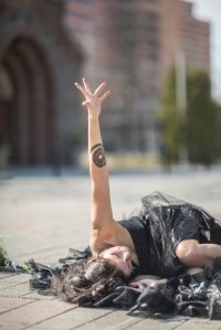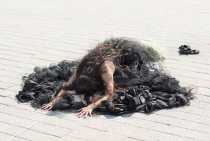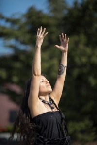 The ritual takes place on top of the round fabric artwork titled Interstice. This piece gets placed on top of chalk lines marking the cardinal directions on the pavement. Placed at the eastern direction are large framed glass pieces used to see reflections. Sage, baby’s breath flowers, and symbolic movements are components of the ritual. A stone and crystal necklace and dress act as protective elements during the ritual. The ritual nears an end with an invocation that leads into bowing to the ground. A circular movement of my body crawling into a fetal position and resting on top of Interstice marks the end of the ritual.
