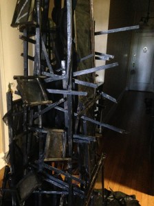 This piece is made of various sized glass panes that are framed with wood. The center structure is also constructed of wood, and the floor piece is made up of leather, fabric, and paper. When I select a material, I value its connection to nature, sacredness, the source, and flexibility.